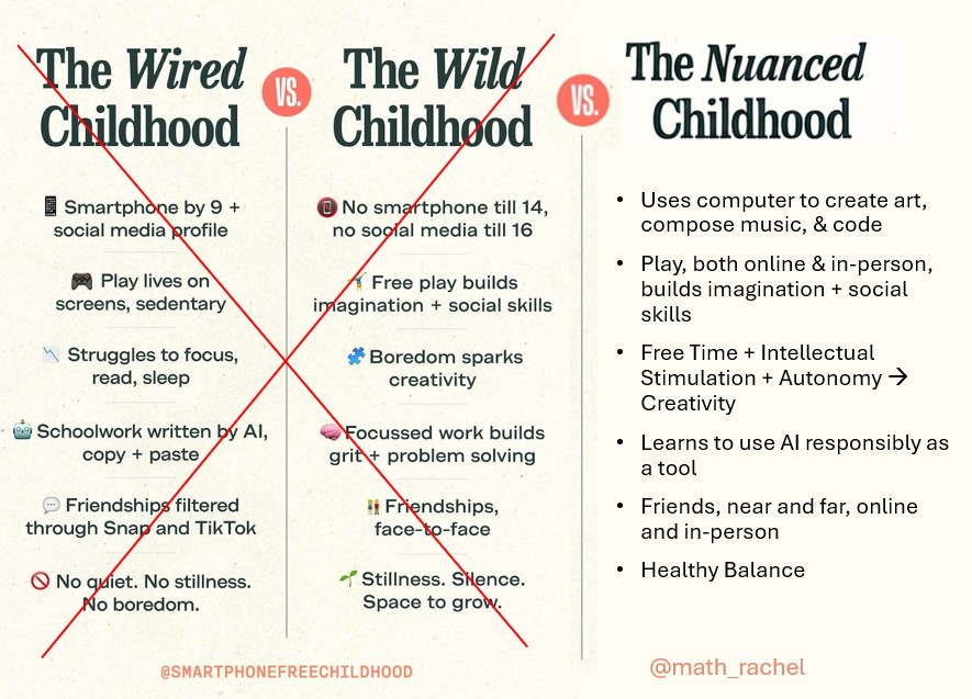 Yet false dichotomies abound. The “wired” side of this popular graphic focuses on the worst possible version of screen use I can imagine. I don’t think children should be on social media, SnapChat, or TikTok. I don’t think people of any age should be unthinkingly copy & pasting work written by AI (although I do think AI is a helpful tool when used appropriately).