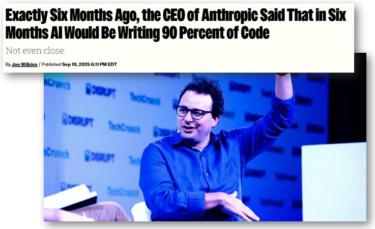 Renowned AI researcher Geoffrey Hinton predicted that AI would replace radiologists by 2021. Google CEO Sundar Pichai and head of AI Jeff Dean predicted that all data scientists would be using neural net architecture search to generate customized architectures for their individual problems by 2023. Anthropic CEO Dario Amodei predicted that by late 2025, AI would be writing 90% of all code. There is an entire wikipedia page documenting the failed predictions of Elon Musk on when we would have autonomous vehicles.